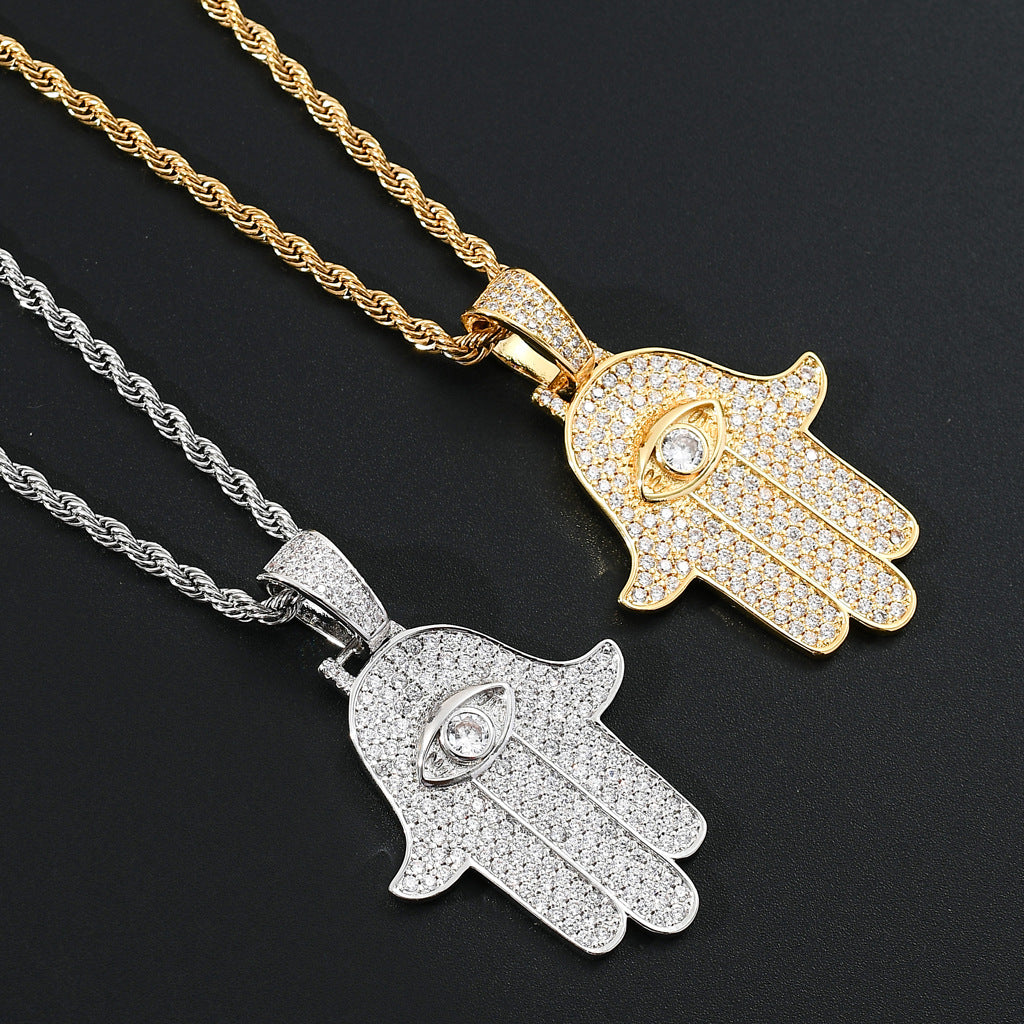 This pendant is made into the shape of a Fatima's Hand, made by copper, flooded with AAA grade Cubic Zirconia stones and plated with 18k gold. The Hand of Fatima represents femininity, and is referred as the woman's holy hand. It is believed to have extraordinary characteristics that can protect people from evil and other dangers.